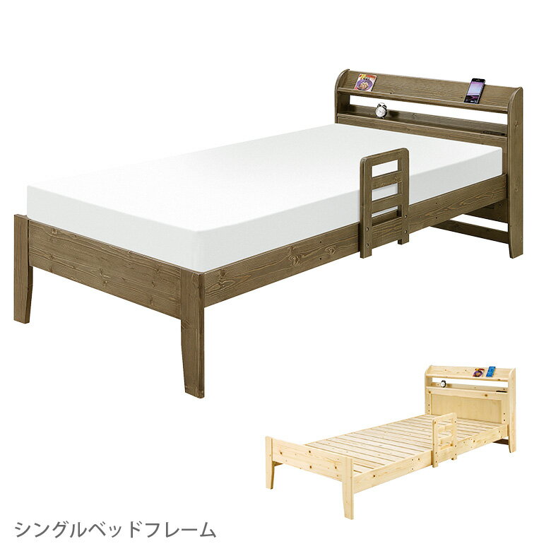 ベッド シングルベッド おしゃれ ベッドフレーム シングル 手すり 1本付 高さ3段階 すのこ パイン 木製 棚付 2口 コンセント付き 宮付き 選べる2色 ナチュラル ブラウン モダン 北欧