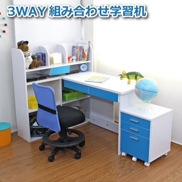 3WAYレイアウトデスクセット デスク+書棚付きラック+3段チェスト ブルー&ホワイト デスク3点セット 学習机 学習デスク 書棚付きラック 勉強机おしゃれ 収納 木製 tcp026